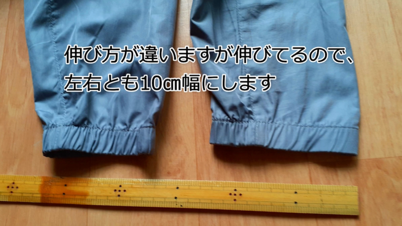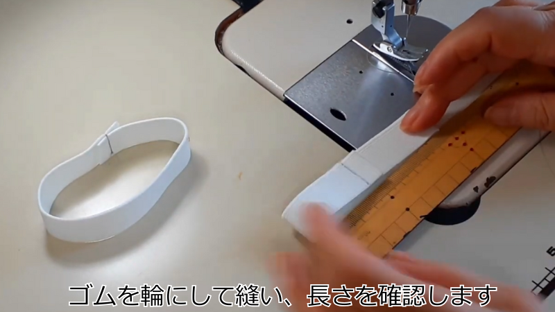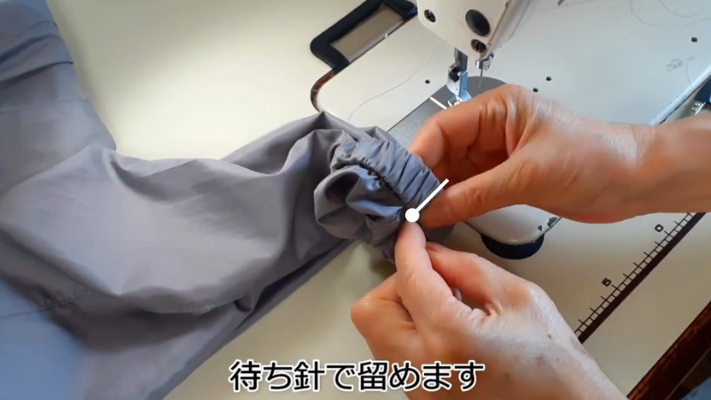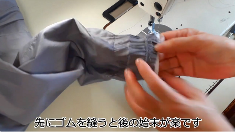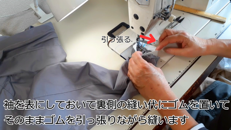 ゴムの長さは、袖の布の長さより短いので、ゴムを均等に引っ張りながら布と長さを合わせミシンで縫っていきます。