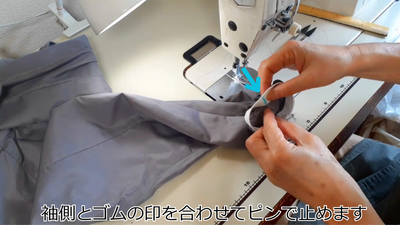 ● ゴムを縫うときは、袖とゴム両方に同じように印を付けて待ち針で合わせ、均等にゴムを引っ張りながら縫うとうまくいく。